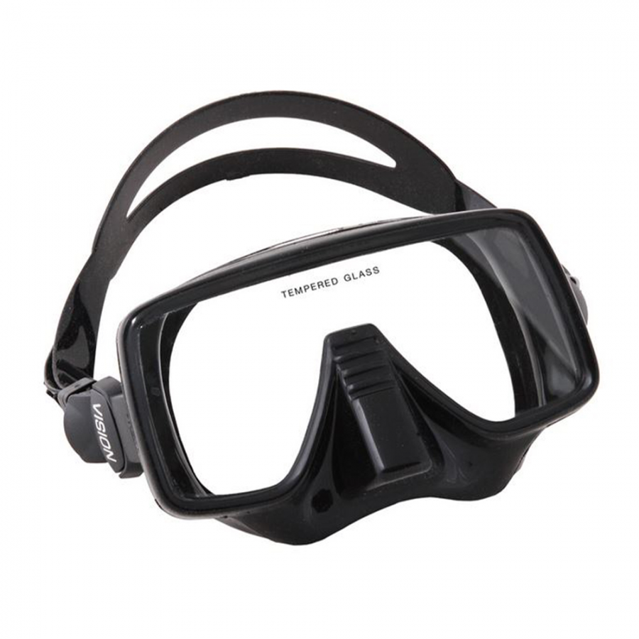 Μάσκα με μονό γυαλί “Frame less”, μαύρη φούστα σιλικόνης και πόρπη με σύστημα γρήγορης ρύθμισης.