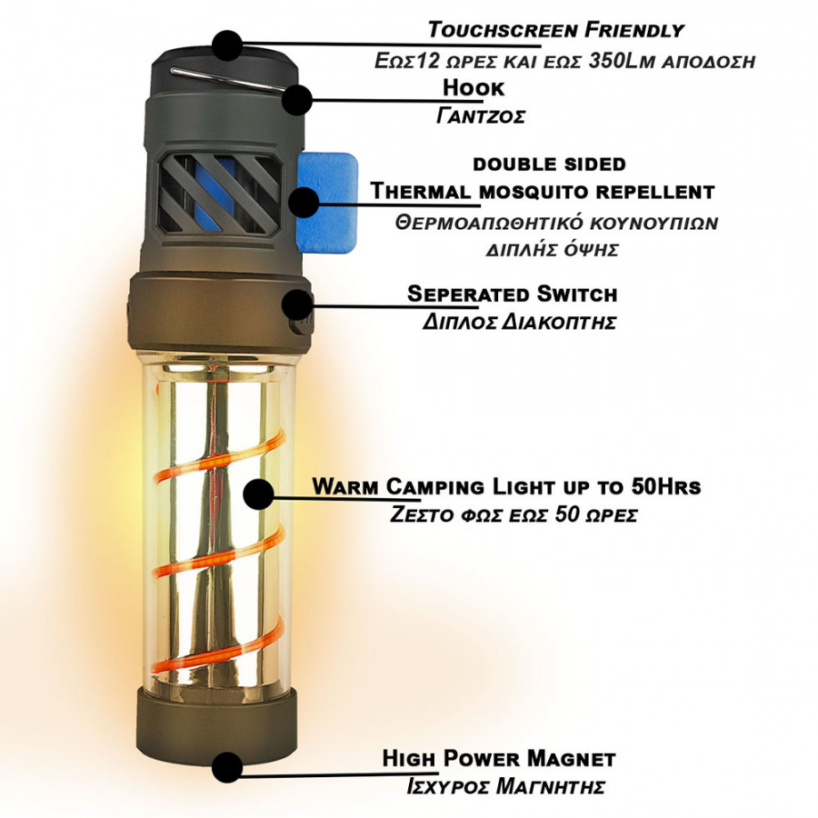 Εξαιρετικά φωτεινό φανάρι κάμπινγκ: Είτε με το φακο χειρος ειτε με το πορτοκαλι φακο camping θα καλυψει ολες τις διαφορετικές ανάγκες φωτεινότητας. Η πλήρης φωτεινότητα 400 lumens μπορεί να διαρκέσει συνεχώς έως και 9 ώρες, αν δεν τη χρειάζεστε τόσο φωτεινή, μειώστε τη φωτεινότητα στα 50 lumens για 50 ώρες! Το φως κάμπινγκ μπορεί να χρησιμοποιηθεί μόνο του ή με απωθητικό κουνουπιών.