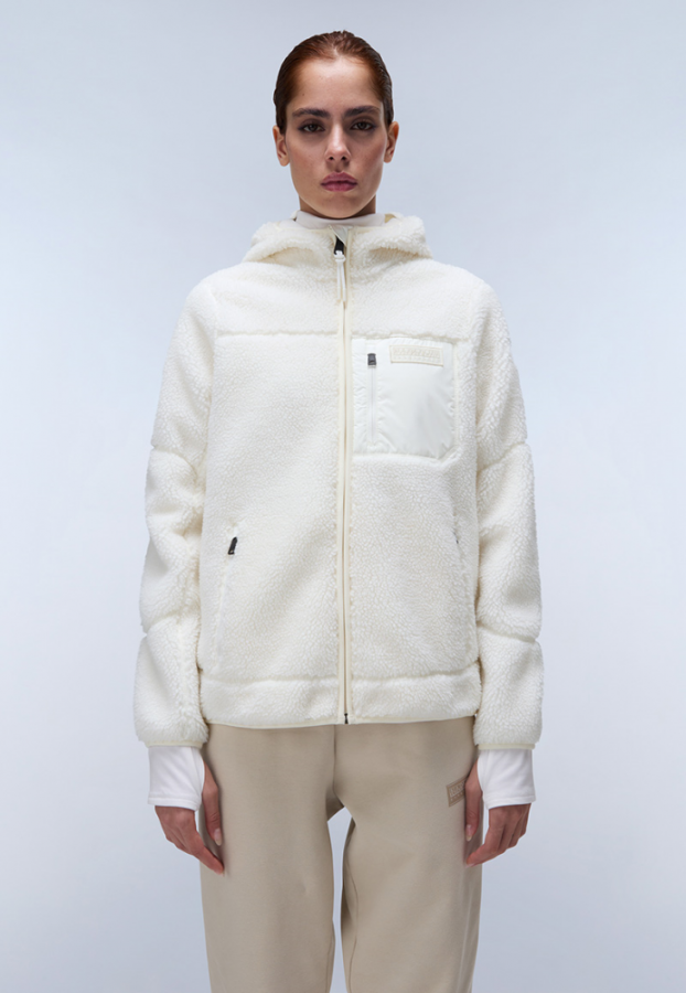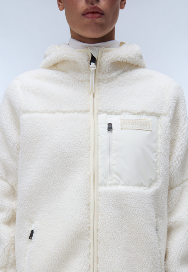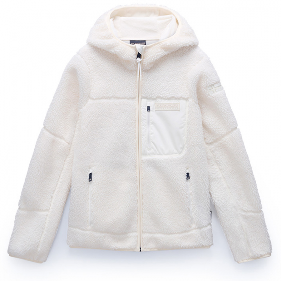 Γυναικεία fleece ζακέτα από την Napapijri σε κανονική γραμμή, μακρυμάνικη, με μπροστινές τσέπες, κουκούλα, ψηλό λαιμό και κλείσιμο με φερμουάρ.