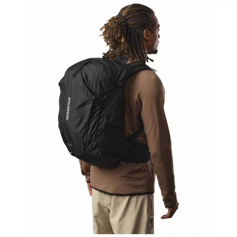 Τσάντα backpack ιδανικά κατασκευασμένη για πεζοπορία λόγω της ισορροπημένης κατανομής του βάρους & της σωστής προσαρμογής στο σώμα. Ένα κύριο διαμέρισμα με εσωτερική θήκη για laptop & πλευρικές θήκες από mesh ύφανση. Ενισχυμένη πλάτη, χειρολαβή & ρυθμιζόμενοι λουριά ώμου με ιμάντες μέσης & στήθους. Ανακλαστικές λεπτομέρειες & στάμπα logo Salomon μπροστά.